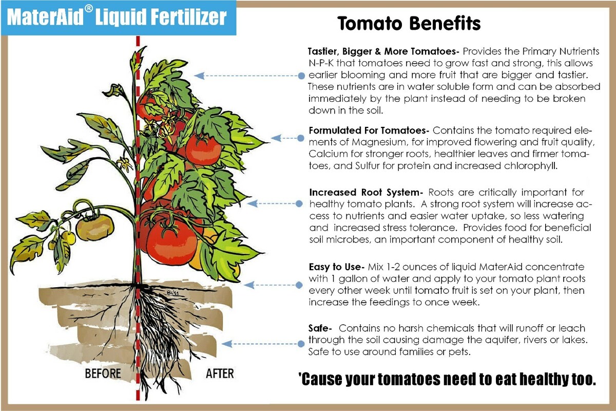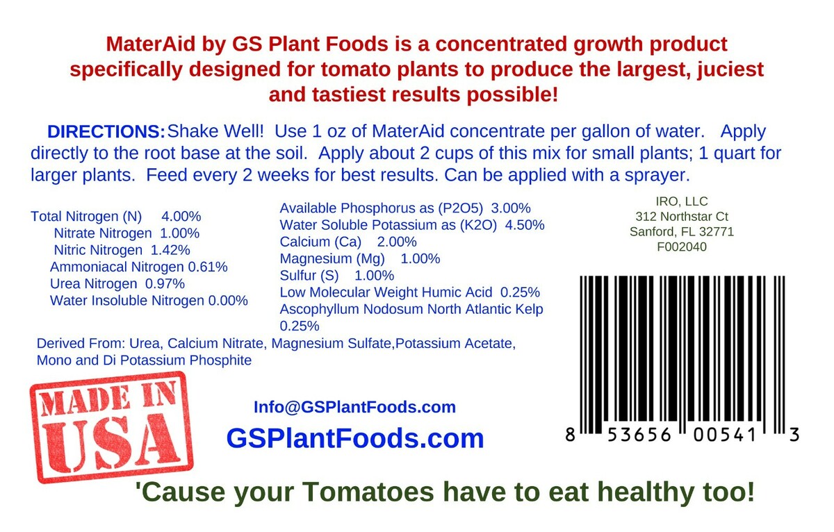 MaterAid is specially formulated to increase the number, the size and the taste of your tomatoes. Tomatoes are different from other plants and to reach their full potential they need a diet of nutrients specifically tailored to their needs. That is why MaterAid contains the tomato required elements of Magnesium, for improved flowering and fruit quality, Calcium for stronger roots, healthier leaves and firmer tomatoes, and Sulfur for protein and increased chlorophyll. MaterAid also has North Atlantic kelp for micronutrients and plant growth promoting enzymes along with humic substances for increased nutrient absorption. MaterAid is the easiest and most economical way to grow the best tomatoes possible right in your own backyard. Mix 1-2 ounces of liquid MaterAid concentrate with 1 gallon of water and apply to your tomato plant roots every other week until tomato fruit is set on your plant, then increase the feedings to once week. MaterAid can be used on other plants and vegetable with amazing results, but it is formulated to be the proper mix of nutrients, micro-nutrients and plant beneficial substances to grow the best tomatoes possible. *Grow the largest fullest flavored tomatoes possible *Easy to use, just mix with water and apply every few days through growing season. *Contains Nitrogen, Phosphorous Potassium along tomato required Magnesium, Calcium Sulfur. *North Atlantic Kelp (Ascophyllum Nodosum) Low Molecular Weigh Humic for maximum growth. *Economical- Highly Concentrated Formula, one ounce makes a gallon of fertilizer.