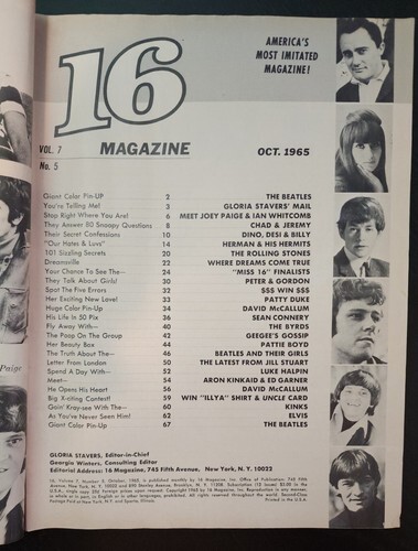 This magazine may have the front and back cover separated--It may have no back cover at all--It may have writing in it--and there may be torn and roached area's along the edges--it was a very prized possession of a teenage girl from the 60's
