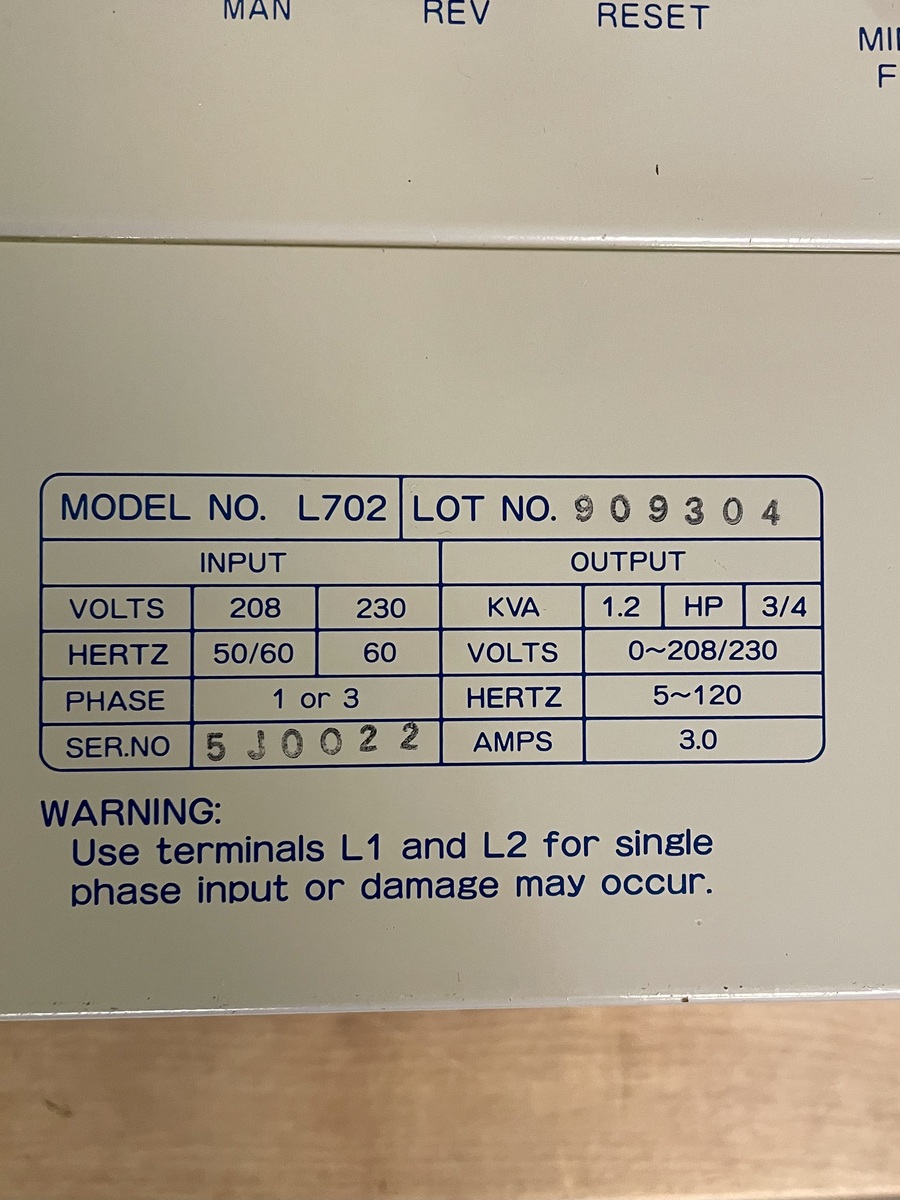 Model: L702 IN: 1 or 3PH 208-230VAC OUT: 3 PH 208-230 VAC 3.0 Amps 0.75 HP