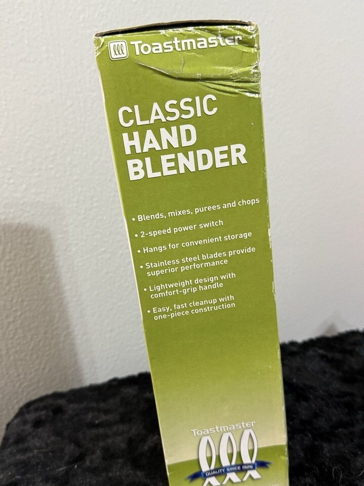 The TOASTMASTER CLASSIC HAND BLENDER MODEL 1740 is a versatile kitchen appliance designed for blending, mixing, pureeing, and chopping tasks. With a 2-speed power switch, this handheld blender offers convenience and ease of use. *****New. Box is damaged as seen in pictures. ****+