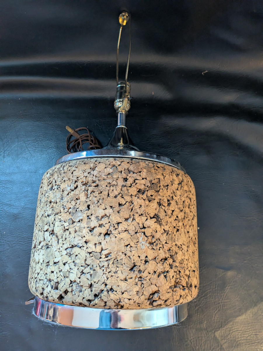 This vintage table lamp features a round cork and chrome design from the Mid Century Modern era. With a funky retro style, it has a metallic finish and a single light. The lamp is corded electric with a brown cord, suitable for indoor use. This unique piece dates back to the 1970s and is in working condition, adding a touch of vintage charm to any space.