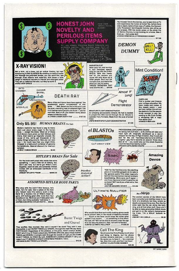 Description: Original cover price: $1.25. Direct edition. Cover Art by John Byrne. Superbman (Superman) vs. the Fantastical Four (the Fantastic Four) in 'My Badguy...My Enemy!': Script Art by John Byrne; Inks by Jerry Ordway. Doctor Bloom (Doctor Doom) appearance. Knick Furey (Nick Fury) stars in 'The Retirement of Knick Furey, Ex-Agent of S.H.E.E.L.D!': Script by Fred Hembeck; Art by John Severin. Woof'r'eam (Wolverine) stars in 'Woof'r'eam!': Script by Al Milgrom, Art by Mike Mignola; Inks by Al Williamson. The Hex-Men (X-Men) appearance. Doctor Deranged (Doctor Strange) stars in 'Doctor Deranged': Script by Peter Gillis; Art by Phil Foglio. Ad parodies by Terry Austin and Marc Siry. (No real ads in this issue). 32 pages, Full Color. 010626-010626T