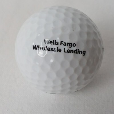 This listing is for a single pre-owned Titleist white golf ball. This golf ball features the logo and name "Wells Fargo Home Mortgage". It is clean and has minor wear. The ball is suitable for normal play.