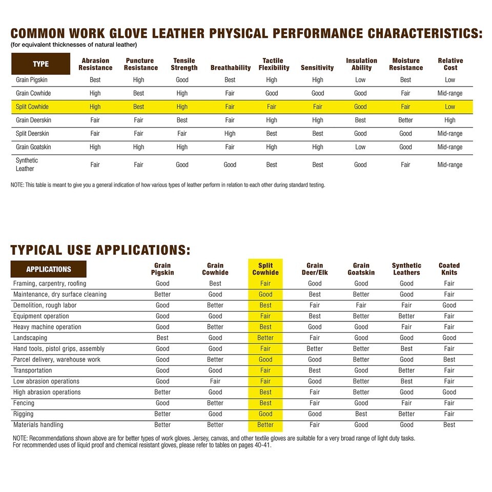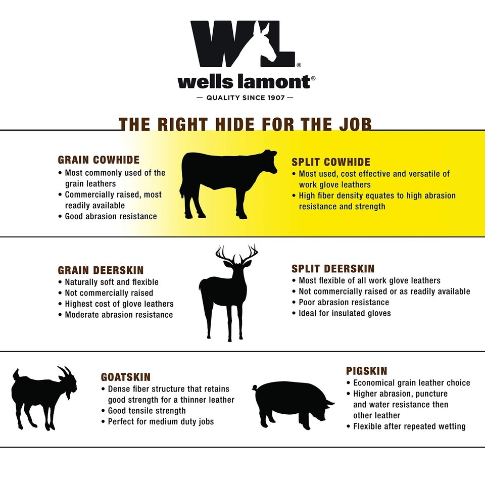 The Wells Lamont has a split cowhide leather palm with an extra reinforced split cowhide leather layer on the palm and first finger. Safety cuff for easy on and off.