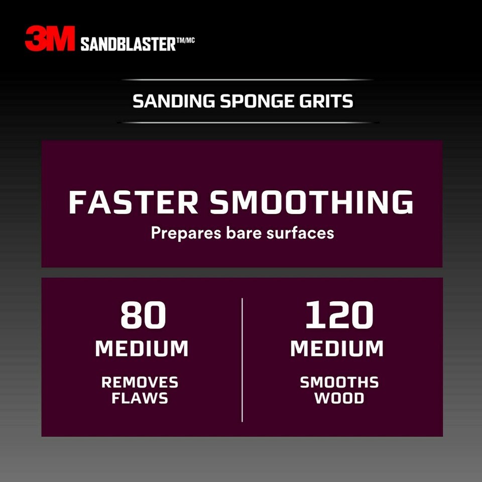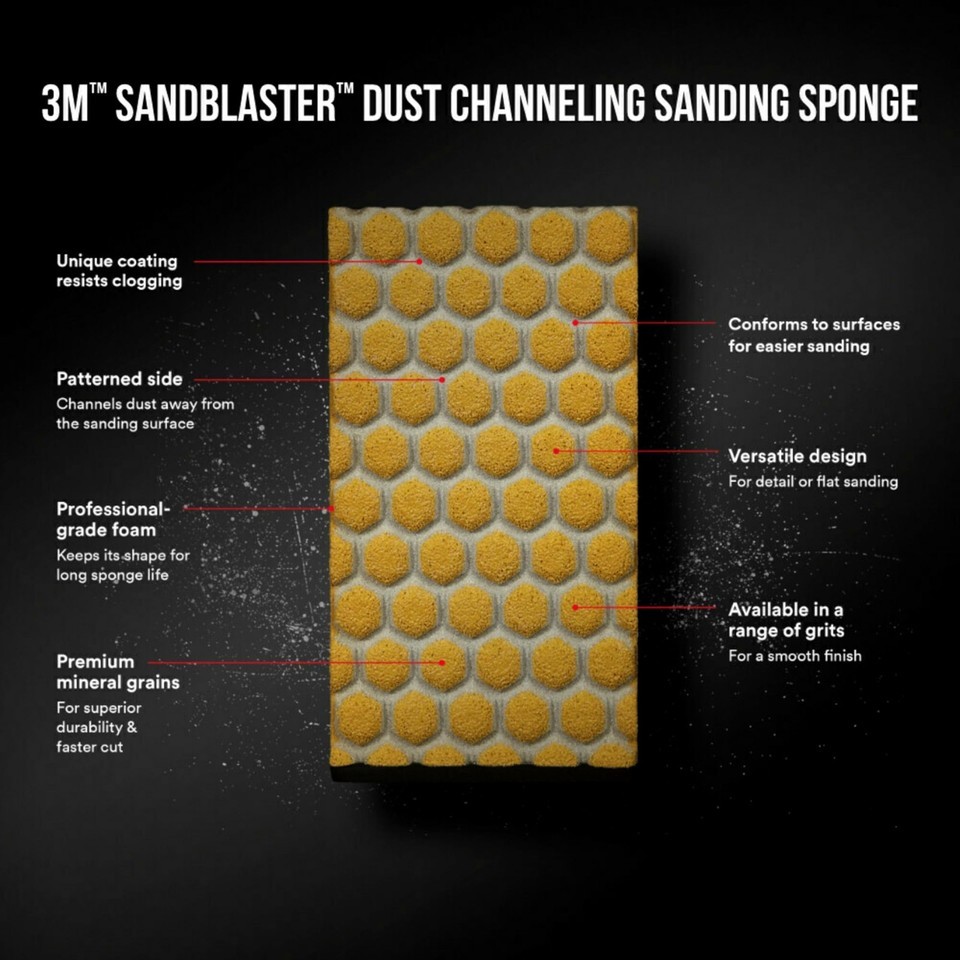 The 3M SandBlaster ultra flexible channel dust sanding sponge is best used on paint, wood, metal and drywall. Use the pattern side for detail sanding and superior conformability. The regular side is best used for flat surface sanding.