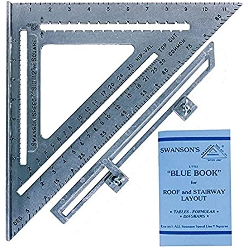 BIG 12 SPEED SQUARE W/LAYOUT BAR, BLUE BOOK The Big 12 Speed Square is a 12-inch version of the Swanson Speed Square with added features for building stairs. This innovative tool combines 7 tools into 1: 1. Try Square, 2. Miter Square, 3. Saw Guide, 4. Line Scriber, 5. Protractor, 6. Out-of-Square Corner Angle Finder, 7. Stair Layout Square. The Big 12 Speed Square is die-cast for durability and accuracy. Made of heavy-gauge aerospace aluminum alloy, it is built to last. Black-filled gradations stand out against a matte finish for easy reading and are simple to use with the Swanson One-Number Method of rafter layout. This model includes the Swanson Blue Book for Roof and Stairway Layout as well as the Layout Bar for use in determining out-of-square corners when building stairways. The Swanson Speed Square is our most popular product and remains the most trusted square of its kind. Look for the Diamond cutout for genuine Swanson products.