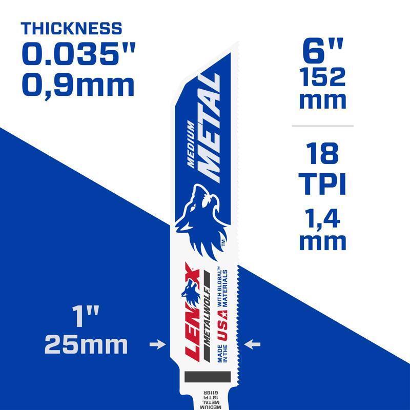 Confidently take on midweight metal-cutting projects knowing your 6 in. 18 TPI METALWOLF .035 in. Thick WAVE EDGE Bi-Metal Reciprocating Saw Blade is capable of handling the job. This 5 pack of blades delivers the fast-cutting performance required for pro-quality results with up to 50% longer life. Engineered to consistently perform straight cuts through medium-thickness metal, its tall structure enables you to complete demanding work while the spring steel backing firms up the blade to help reduce breakage.