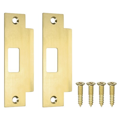 These standard latch strikes are constructed of steel and come in a bronze-plated finish. They feature an adjustable tab designed to eliminate the door slop and chatter of closed doors and theyre installed with two #8 x 1 in. fasteners included with each package. These latch strikes are used to replace a variety of residential interior and exterior door strikes.
