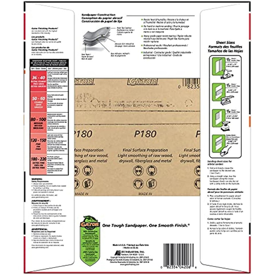 Product Description Multi-purpose aluminum oxide sandpaper provides excellent performance at a value price. These sheets are ideal for both hand and power tool sanding on wood, metal, fiberglass and painted surfaces. Aluminum oxide is a durable grain that is recommended by professionals for general sanding a wide variety of surfaces. From the Manufacturer Gator Grit 25 Count 9" x 11'' 180 Grit Extra Fine General Purpose Sandpaper. The 180 grit extra fine sandpapers are designed for use on wood, metal, drywall, fiberglass and painted surfaces. You can use these sheets to sand by hand or with a machine. The sheets can also be used with an orbital sander by cutting the sheets into 1/2 sheet, 1/3 sheet or 1/4 sheet to fit your orbital sander.