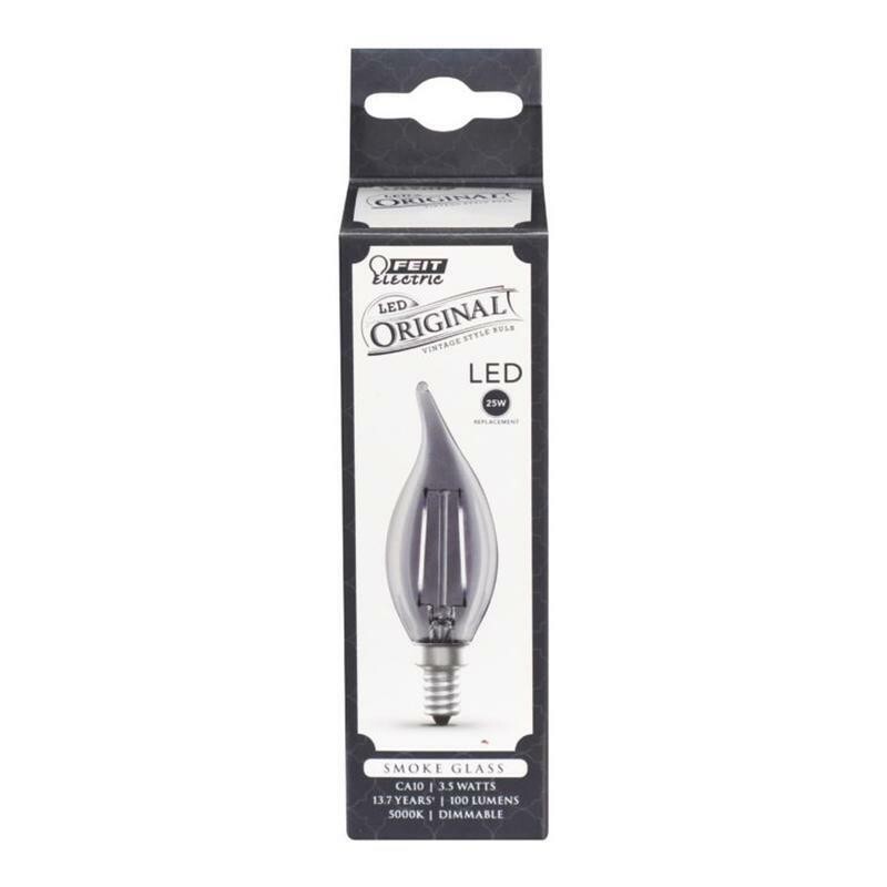 Enjoy all the benefits of advanced LED energy-saving technology with the dimmable Feit Electric CFT/SMK/VG/LED 3.5w Flame Tip LED Original Vintage Light Bulb. The smoke glass bulb produces a light output of 100 lumens and uses 3.5 watts of electricity, 86% less energy than an equivalent incandescent bulb. Get instant on to full brightness with relatively cool running performance. The Original Vintage LED light bulbs have an average life of 15,000 hours / 13.7 years are RoHS compliant and are 100% mercury free. Choose a dependable decorative bulb for residential or commercial applications.