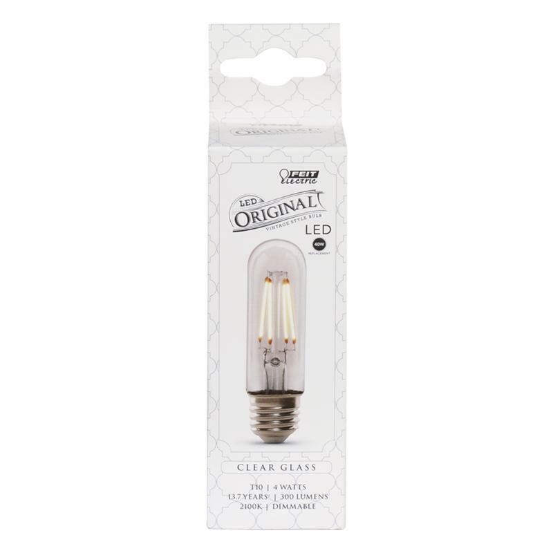 Enjoy all the benefits of advanced LED energy-saving technology with the dimmable Feit Electric T10/CL/VG/LED T10 4w LED Original Vintage Light Bulb. The clear glass bulb produces a light output of 300 lumens and uses 4 watts of electricity, 84 percent less energy than an equivalent incandescent bulb. Get instant on to full brightness with relatively cool running performance. The Original Vintage LED light bulbs have an average life of 15,000 hours / 13.7 years are RoHS compliant and are 100 percent mercury-free. Choose a dependable decorative bulb for residential or commercial applications.