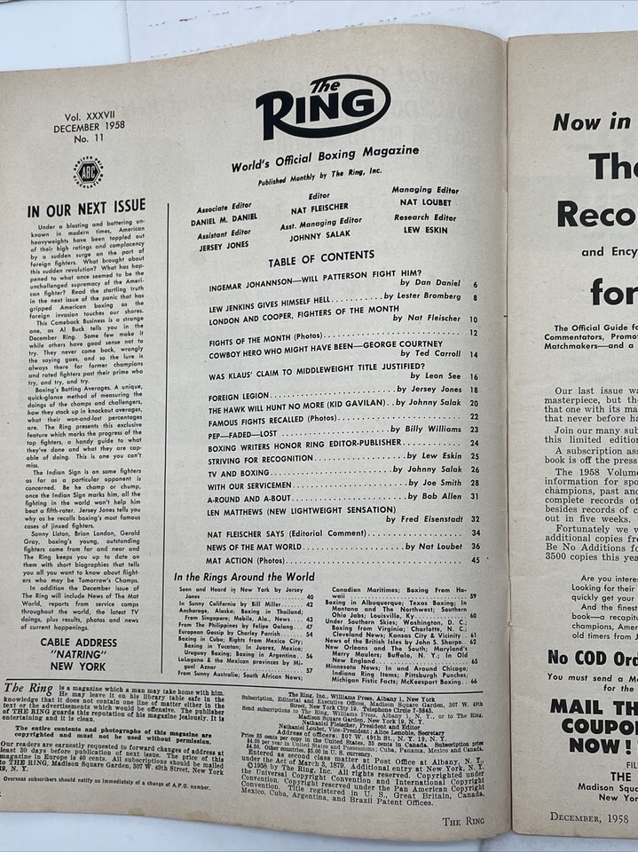 The Ring Vintage Boxing Magazine Rare 1958 December Lew Jenkins Johansson