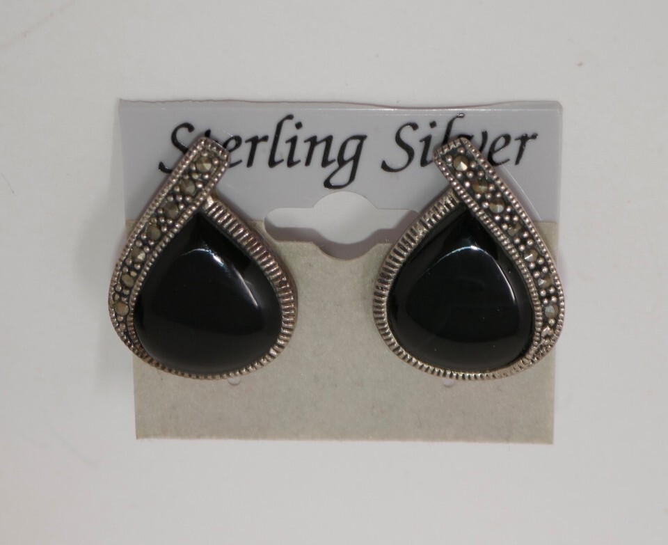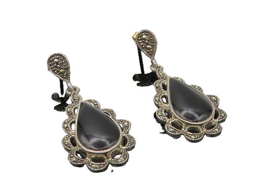 Sterling Silver 925 Black Onyx Marcasite Teardrop Clip On Earrings