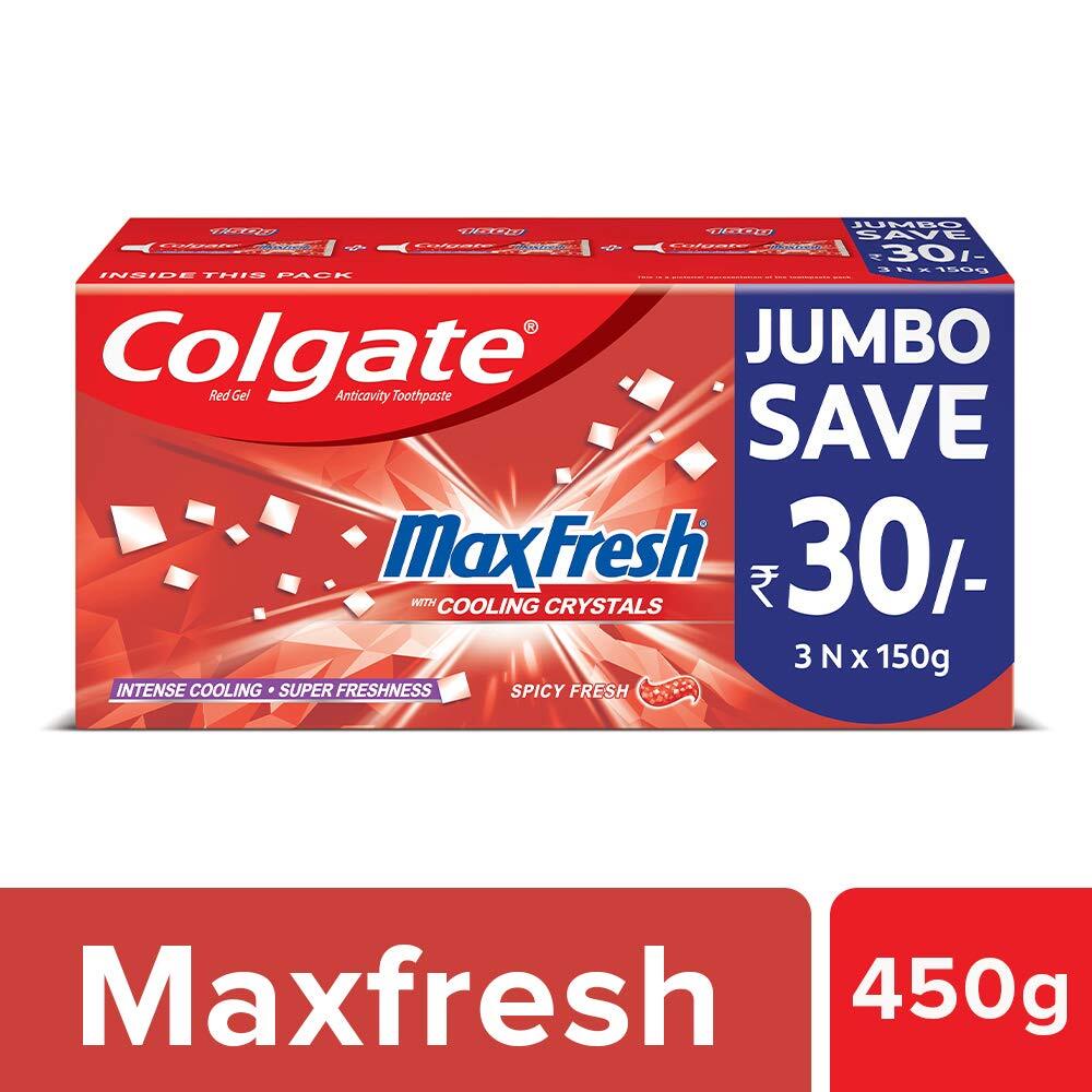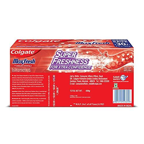 Product description: Switch on the power of freshness with Colgate Maxfresh toothpaste that refreshes you and helps you seize the day because every morning is a fresh start. The red gel toothpaste contains unique cooling cyrstals that give you an intense cooling while you brush. Colgate is India?s most trusted oral care brand. As a trusted partner, we are committed to doing business with integrity and respect for all people and the world around you. Colgate offers quality oral care products, including toothpastes and toothbrushes,as well as expert dental health information. Colgate toothpastes are always 100% vegetarian and gluten free. We care about our environment, Colgate India is the nation's first to earn True Zero Waste Platinum certification for all its four manufacturing sites in India, from Green Business Certification Inc. (GBCI). This toothpaste is made in India, with highest quality standards.