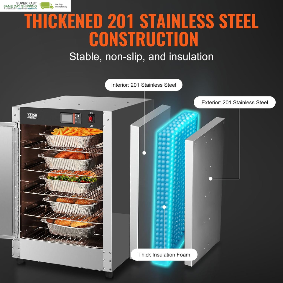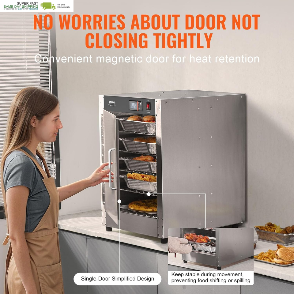 Sturdy and Durable Construction: Made of thickened 201 stainless steel, this hot box is strong and resistant to deformation. The convenient magnetic door ensures a tight seal to retain heat. The stable design allows easy transitions from countertop to floor without compromising security or stability.