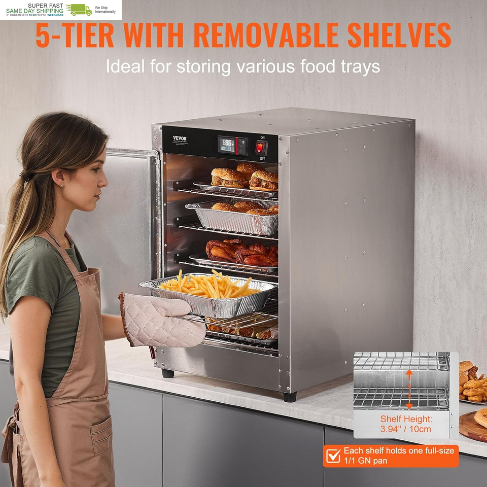 Spacious Multi-Tier Design: This food warmer cabinet includes 5 spacious shelves with a height of 3.94"/10cm, and can each hold one full-size 1/1 GN pan. The shelves are durable and suitable for various food trays, with the flexibility to be removed for taller items.