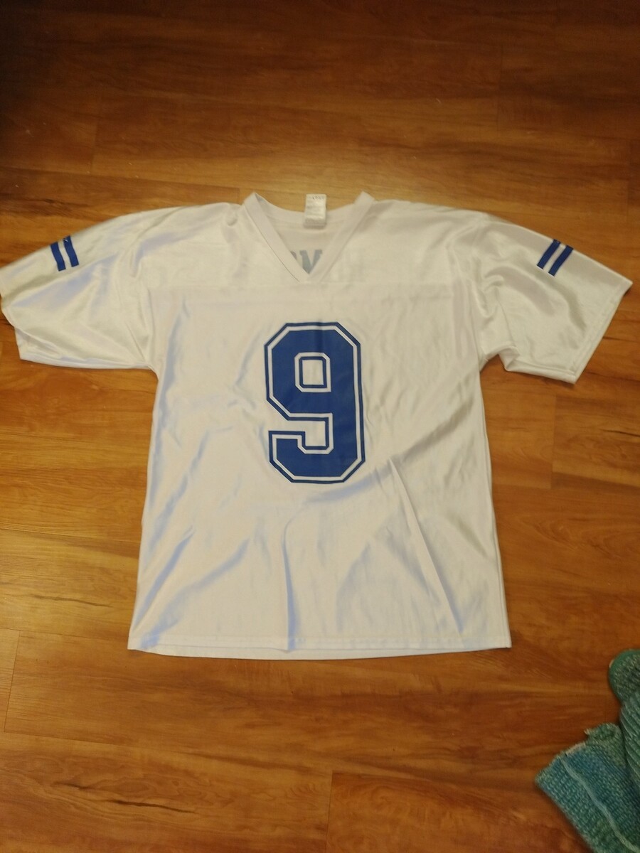 This awesome football jersey was found in a local thrift store and has been freshly dry cleaned. There are no rips, tears, holes or stains on it.