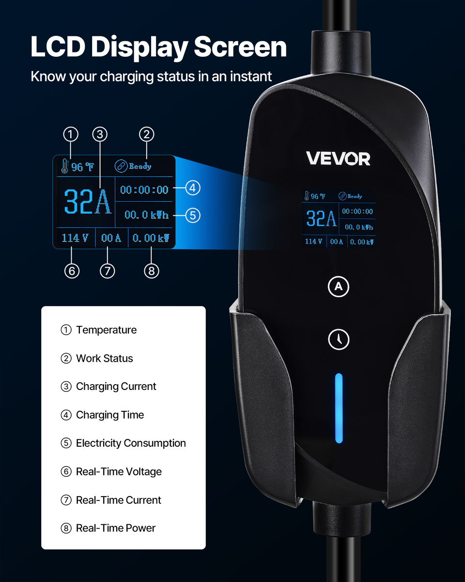 LCD Screen at a Glance: Our J1772 electric car charger is built with a bright LCD display, showing real-time charging data like voltage, current, power, and time. Schedule charging 1โ12 hours in advance for peace of mind overnight
