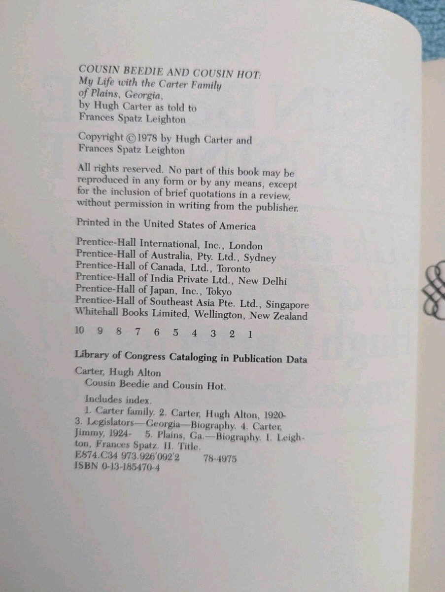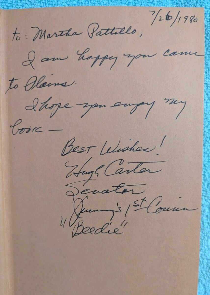 Hugh Carter (Beedie) was the cousin of the late President Jimmy Carter and he has signed personalized the book.