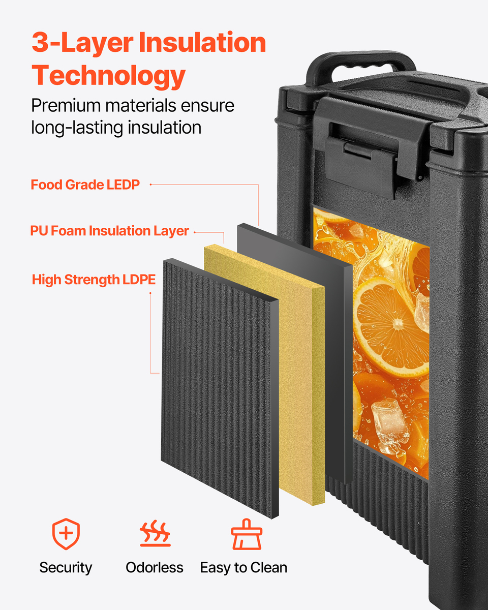 Long-Lasting Insulation: With a thick, high-density foam layer, this insulated beverage dispenser keeps drinks hot or cold for hours. It's perfect for coffee shops, restaurants, buffets, outdoor events, and other professional settings