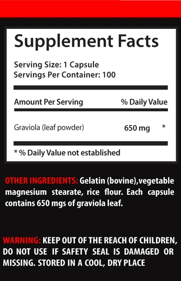 OTHER INGREDIENTS: Gelatin (bovine), vegetable magnesium stearate and rice flour. Each capsule contains 650 mgs of graviola leaf