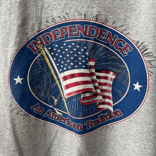 Delta pro weight, short sleeve, gray T-shirt in cotton and polyester blend with an independence an American tradition, American flag graphic on the front. Laying flat measures 27 inches shoulder to hem and 23.5 inches armpit to armpit. No stains or holes.