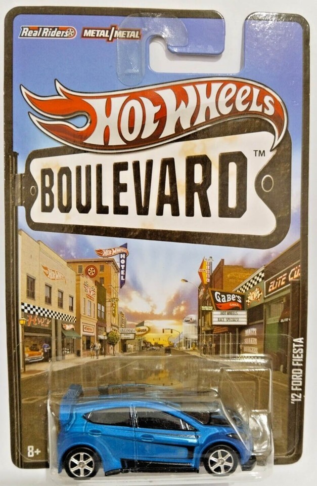 Blue '12 FORD FIESTA Hot Wheels Boulevard Series with Red Real Riders.