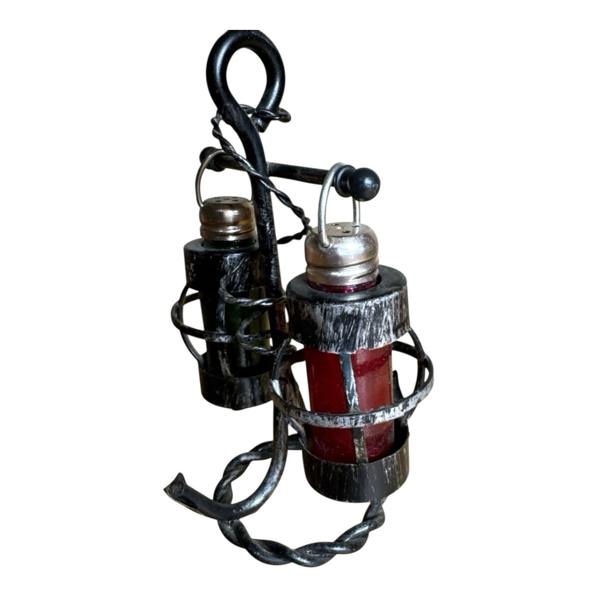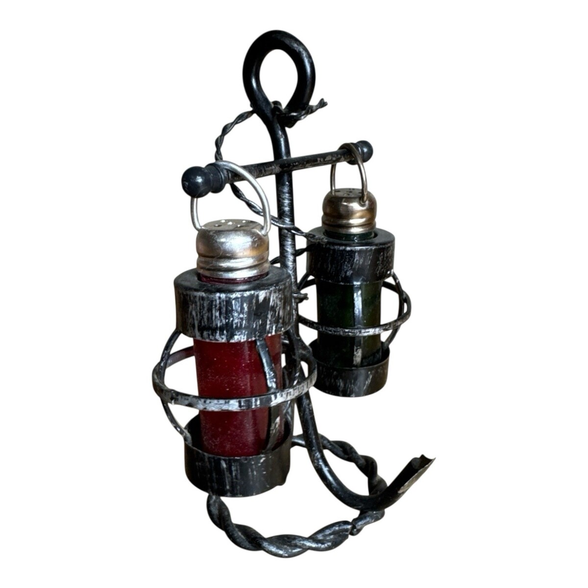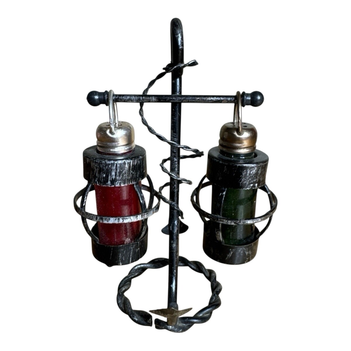 Vintage Nautical Lantern Salt & Pepper Shakers Red Green Hanging On Anchor Stand