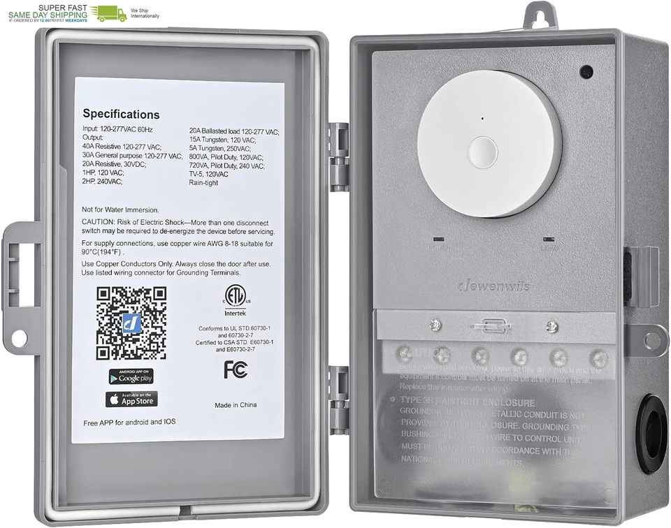 Output 6 20A Ballasted load 120-277 VAC Output 7 15A Tungsten, 120 VAC Output 8 5A Tungsten, 250 VAC Terminal Range #14-#8 AWG Operating Temperature -40F to 140F Control System Smart Life, dewenwils, Alexa, Google Assistant