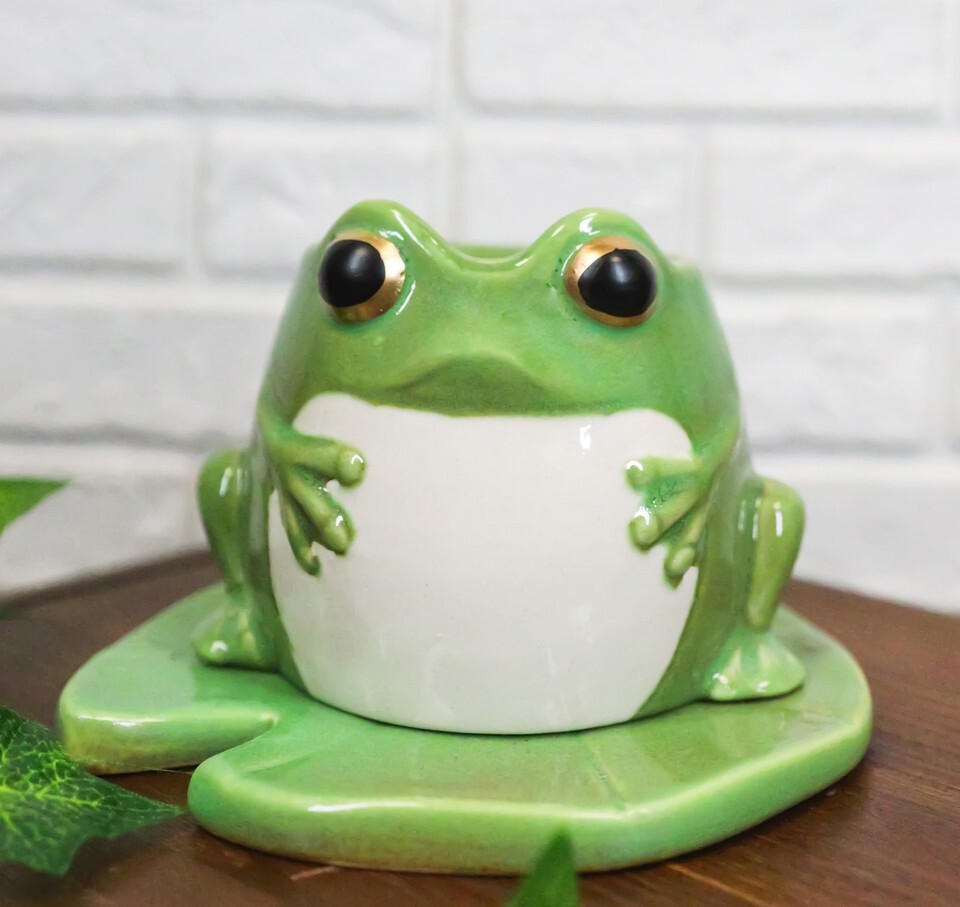? Guaranteed to bring joy and smiles, this whimsical frog-shaped oil burner looks as though it's leapt straight out of a fairytale and landed on its matching lily pad plate. A conversation starter, this unique piece is perfect for anyone looking to add extraordinary charm to their home. It also makes a fantastic gift for frog and wildlife lovers alike!