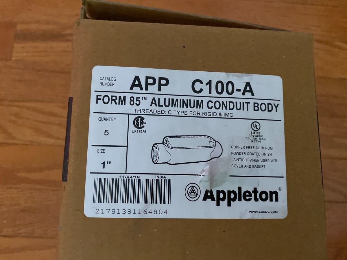 The Appleton APP C100-A 1" Aluminum Unilet Conduit Outlet Body Form 85 is a set of four stand-alone conduit outlet bodies designed for rigid metal conduit. With a nominal angle of 85 and a current rating of 100 A, these silver aluminum outlet bodies from the trusted brand Appleton are rigid and Weatherproof. Made in the United States, these units are perfect for various electrical installations requiring conduit bodies with specific mounting style and angle requirements.