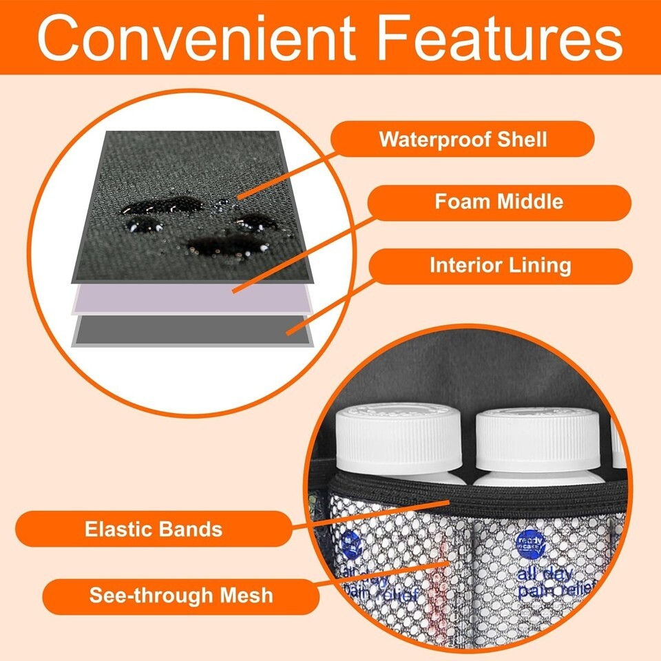 [See-through Mesh Pockets] with elastic bands make it easy to see the contents and to slip medicines in/out while keeping contents in place when traveling.