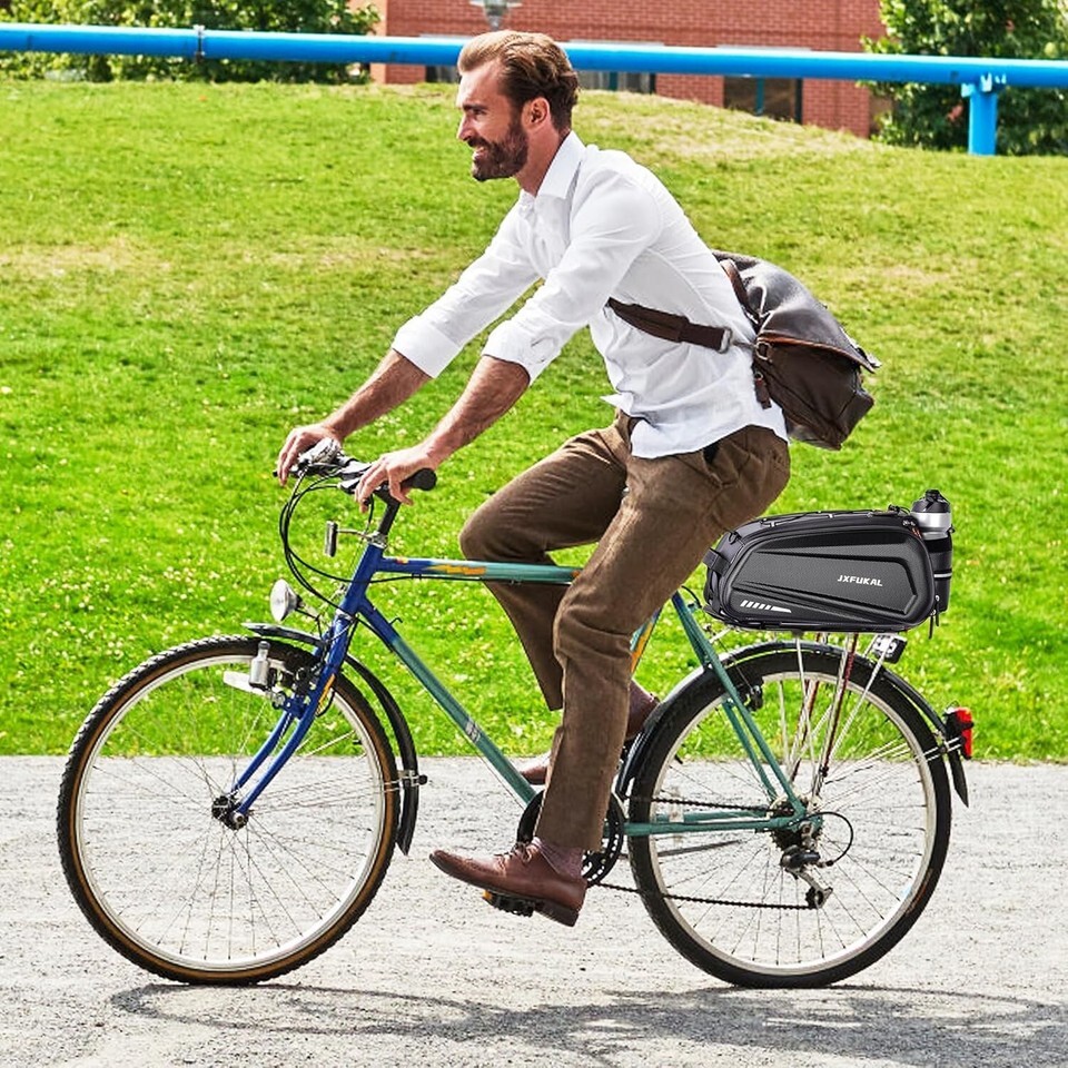 ?17L CAPACITY: Our bike rack bag includes a main compartment, 2 added side bags, 5 inner mesh pockets, an extra top pocket, and an adjustable elastic cord. Dimension of x x inches(L x W x H), it's up to 17L, large enough to store and keep riding essentials organized, such as bike tool kit, pump, wallets, s, power banks, small speakers, towels, clothes, food, drinks, bike locks, sunglasses, etc.