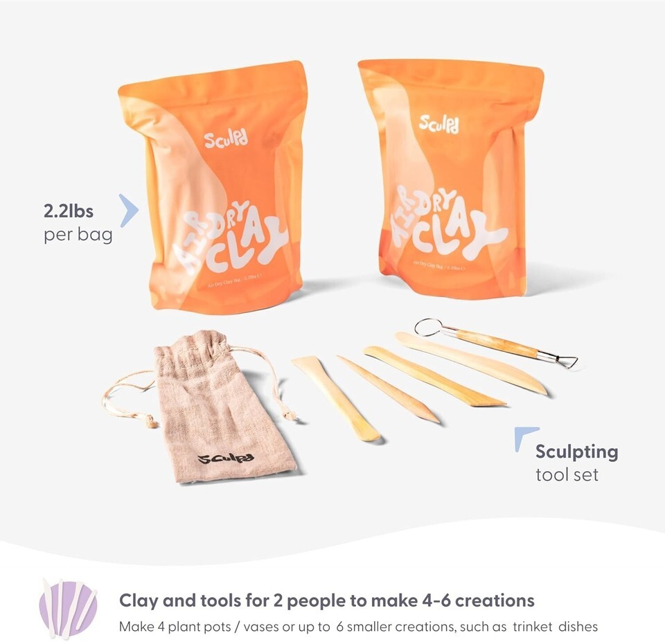 COMPLETE AIR DRY CLAY KIT: Your Home Pottery Set contains everything for 2 people to easily sculpt, paint, varnish, and finish beautiful waterproof plant pots, sculptures, vases, and more.