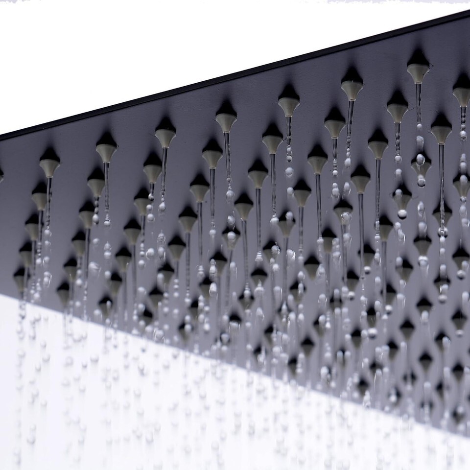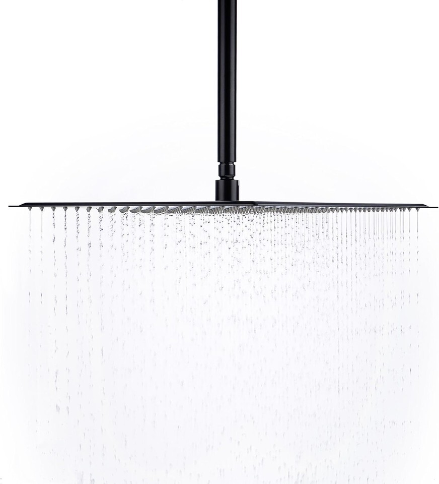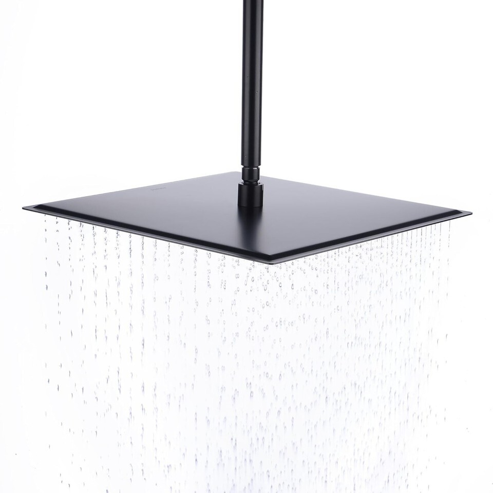 Description: Shape: Square Color: Black Material: High quality 304 Stainless Steel Finish: Matte Black Flow GPM Connector:G1/2 connector, fits most shower arm Product Weight: 8 Pounds Size:16 inch and only inch thick