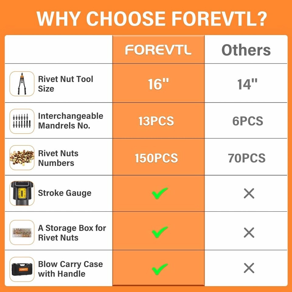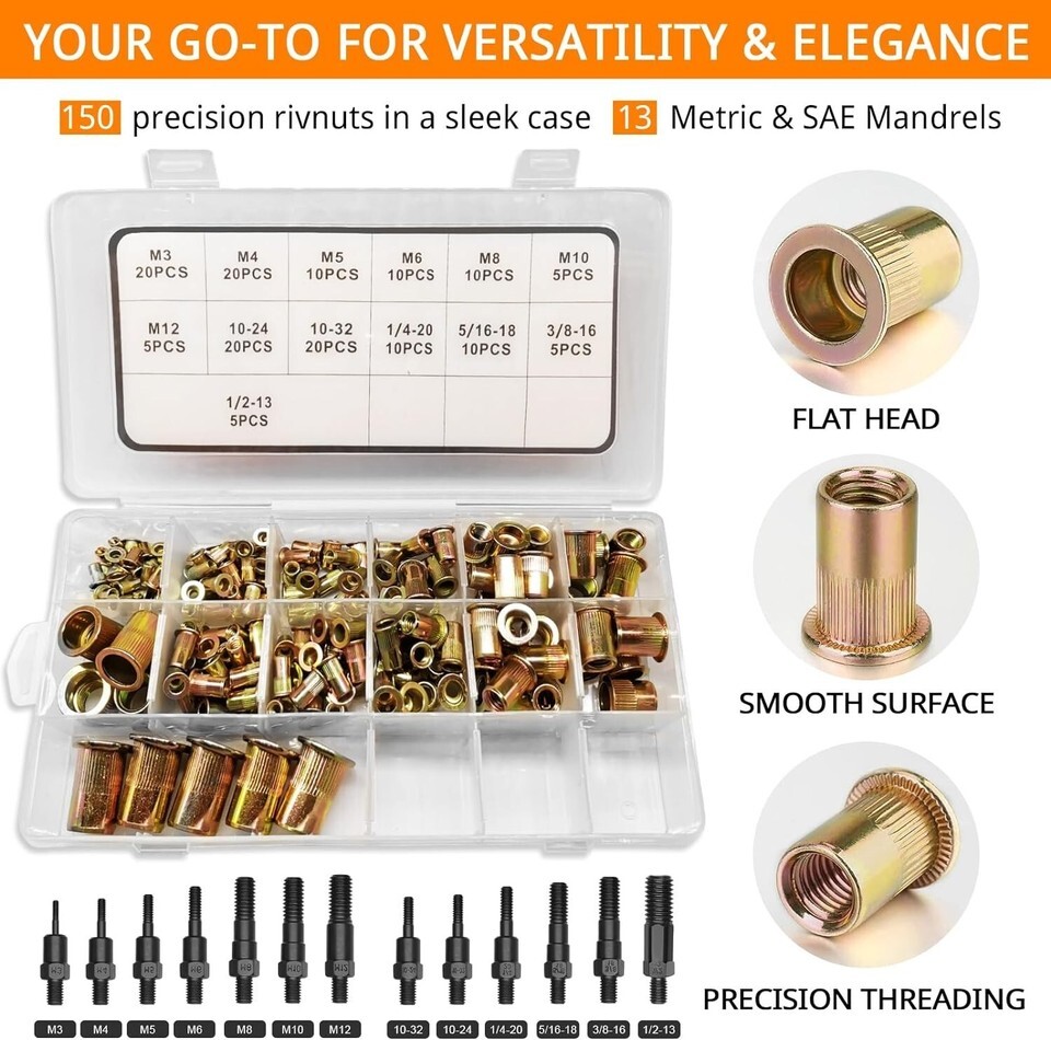 Organized Storage Solution: Rivnut tool kit comprises a 16?? rivnut tool, 13pcs interchangeable mandrels(Metric M3, M4, M5, M6, M8, M10, M12; SAE 10-32, 10-24, 1/4-20, 3/8-16, 5/16-18, 1/2-13), 150pcs rivnuts, a transparent storage box for the rivnut, a wrench, a user manual, and a sturdy blow-molded case for organized storage.