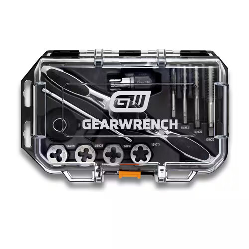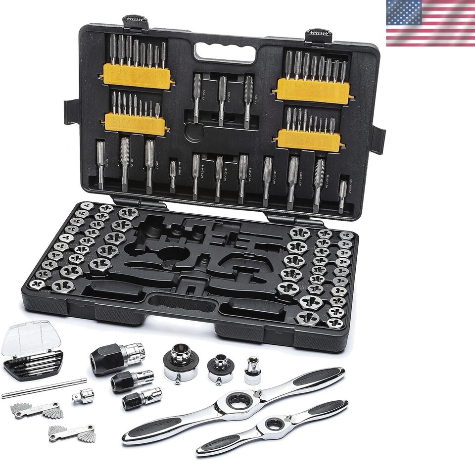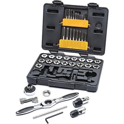 From the Manufacturer Gear wrench 114-Piece large ratcheting tap and diet set SAE/metric, consisting of: 82800 large ratcheting T wrench, 82801 large locking tap adapter, 82802 large hex die adapter, 3881 medium ratcheting T wrench, 3883, medium tap adapter, 3882 small tap adapter, 3884 medium die adapter, 82803 male extension adapter, 82804 female extension adapter, sliding T for adapters, 4mm hex key, 5 screw extractors, metric thread gauge, SAE thread gauge, 48 taps and 48 dies. Complete set of 48 taps and 48 dies, plus small, medium and large system of ratcheting T handles, locking tap adapters and hex die adapters. Taps and dies are made from high quality carbon tool steel. Gear wrenches ratcheting -I handle systems are perfect for the master Mechanic or Machine Shop. Set comes with blow molded case for safe and organized storage. See more