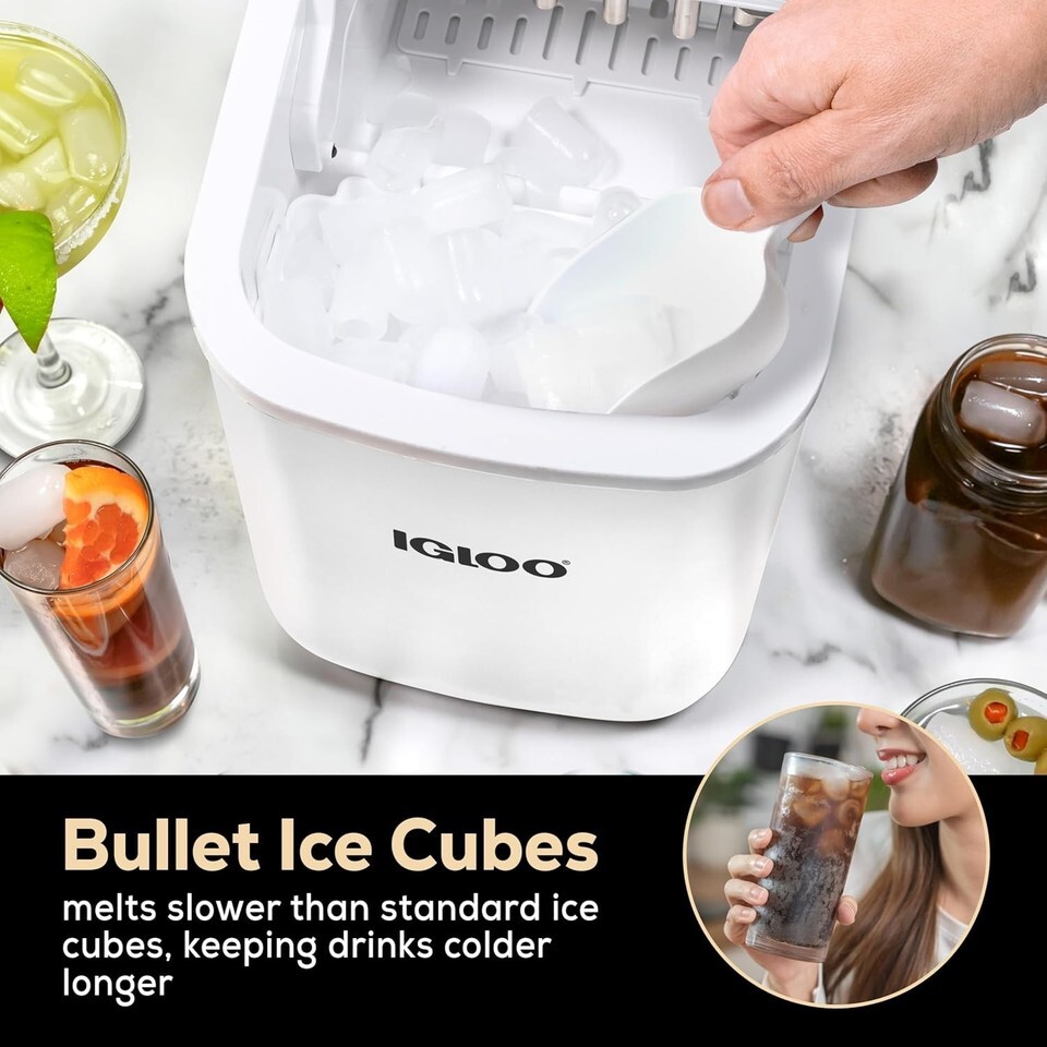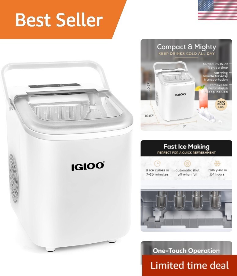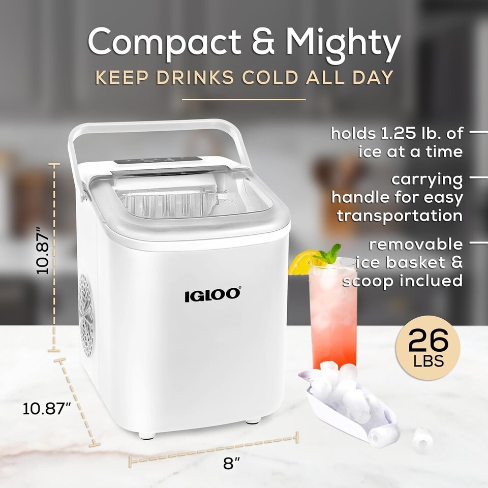 Say hello to this perfectly compact, stylish and portable appliance that will keep your beverages nice and chilled! With the ability to make ice in as little as 7 minutes, this unit has the capability to produce 26 pounds of ice per day. Comes with an easy carry-handle, allowing you to bring the ice maker from room to room. A viewing window allows you watch the ice being made, while the 1. 25-pound ice basket ensures plenty of capacity for all of your beverage needs. The automatic five-cycle self-cleaning function makes clean up easy and allows clean ice to be made every time. The LED-lighted control panel lets you to choose from small or large ice cube sizes, while also letting you know when to add water and if the ice basket is full. Perfect for pool parties, home bars, dorm rooms, offices and more! Cold Drinks. Warm Smiles.