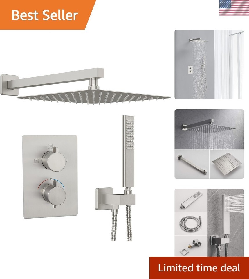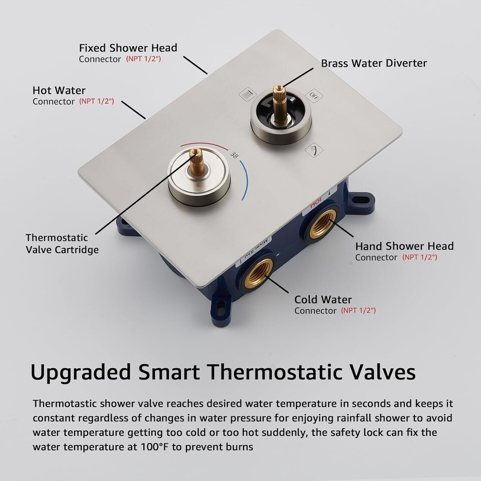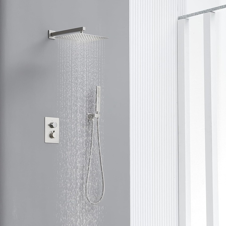 Thermostatic Shower System Wall Mount with 12 Inch Rainfall Shower Head and Handheld Bathroom Shower Set Contain Shower Faucet Mixer Valve Trim Kit Valve Included,Brushed Nickel