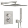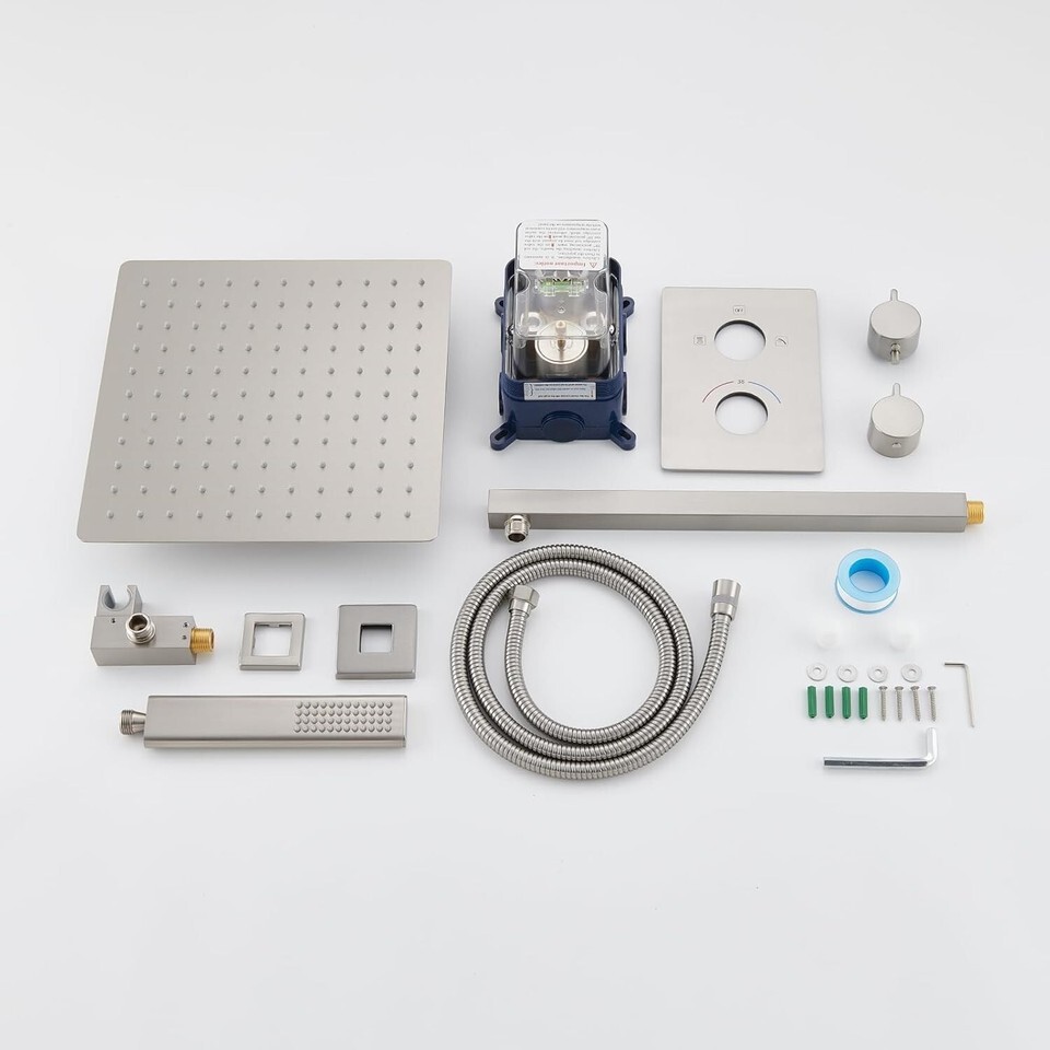 Package include: 1*12 inch Square rain shower head?304 stainless steel) , 1*handheld shower head?Brass) , 1*16 inches shower arm?Brass) , 1* shower hose?304 stainless steel) , 1*shower holder?Brass) , 1*Thermostatic shower mixer control valve?Brass) ;