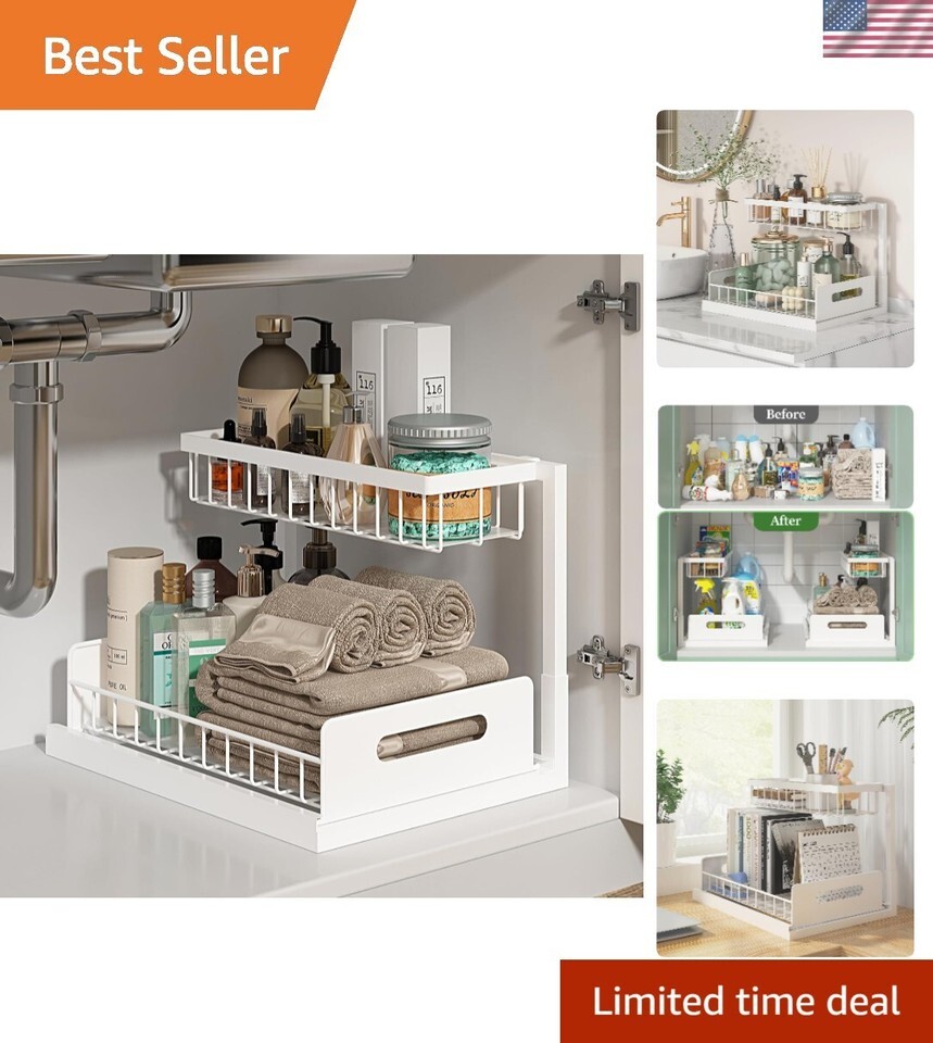 Under Sink Organizer, Pull Out Cabinet Organizer 2 Tier Slide Out Sink Shelf Cabinet Storage Shelves, Under Sink Storage for Kitchen Bathroom Cabinet, White, 1 Pack