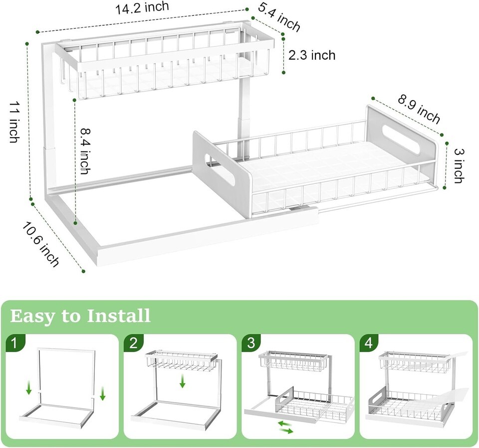 Sliding Storage Drawer: The under sink organizer is designed as a sliding drawer with handles, can be pulled out from both sides, allowing you to easily access the items stored at the bottom