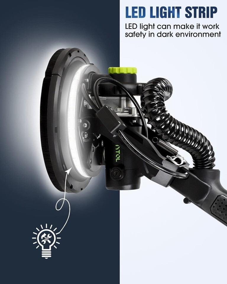?UNIQUE BREAKTHROUGH DESIGN?Drywall sander with vacuum adopts a 9-inch + 360 rotatable sanding disc to achieve uniform polishing, a detachable sander base effectively solves the dead angle of sanding; drywall adopts two layers of annular LED light belt, which can work normally even in a dark environment.
