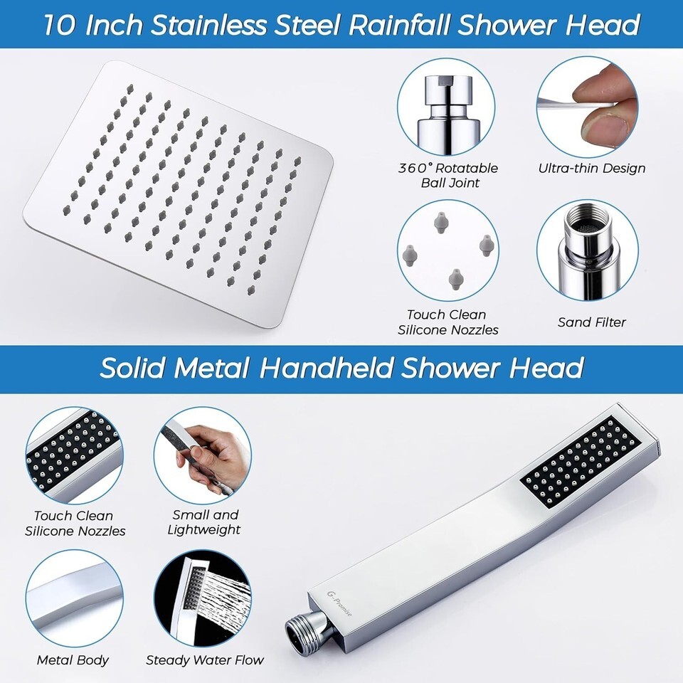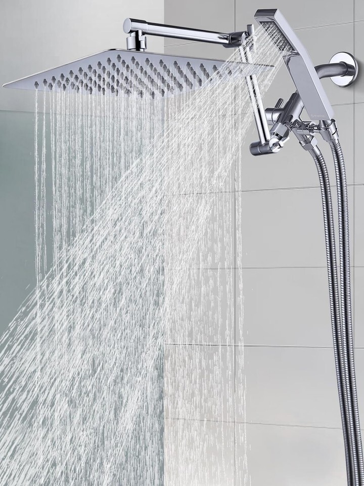 SHOWER HEAD COMBO: 10" rainfall shower head with handheld wand. Both are metal construction that not easy to break. The top shower brings a powerful water flow to you. The handheld sprayer makes you feel a convenient shower experience