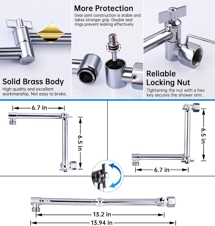 FLEXIBLE EXTENSION ARM PATENTED DESIGN: The length of 13 inch avoid the trouble of being too close to the wall when showering. Two knobs allows you choose any height and angles you need. Easily tightened