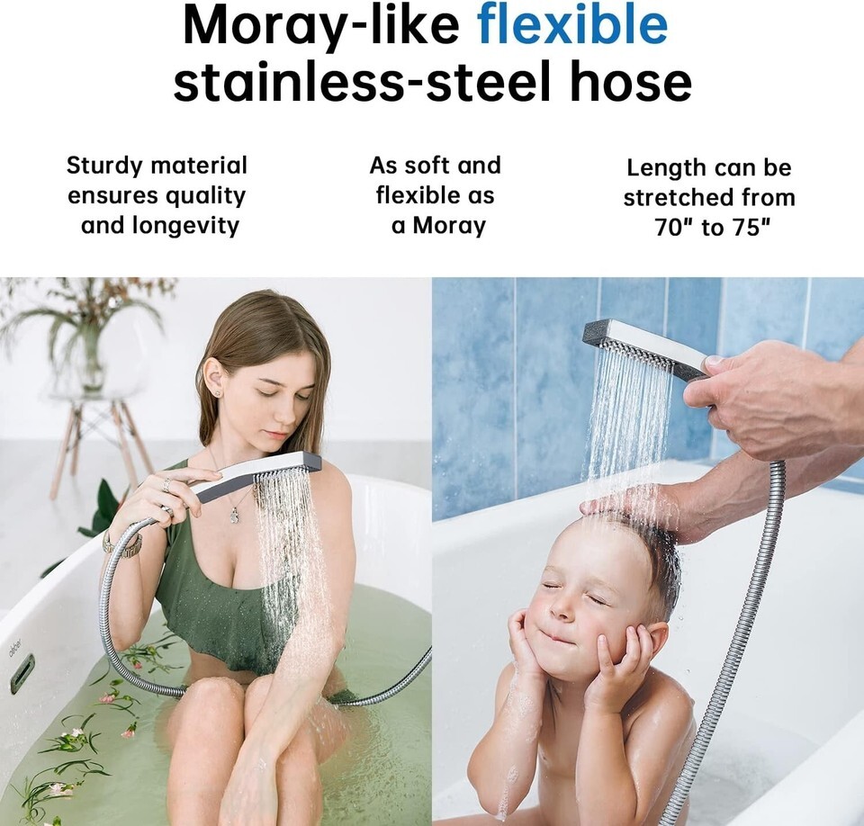 ALL METAL HANDHELD SHOWERHEAD AND LONG HOSE: The hose can be stretched from 70" to 75". it's easy for you to shower yourself, bath your babies, your pets or cleaning the toilet. A good quality hose refuses winding