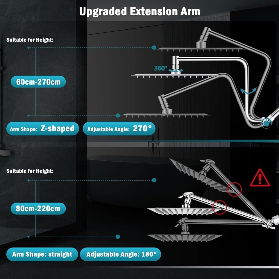 [Improved Adjustable Extension Arm] The shower's height and angle can be modified as needed. The Z-shaped design can achieve vertical water and raises your shower head while improving its bearing capacity. To better cover the shower area, the 12-inch extension arm pulls the shower head further away from the bathroom wall.
