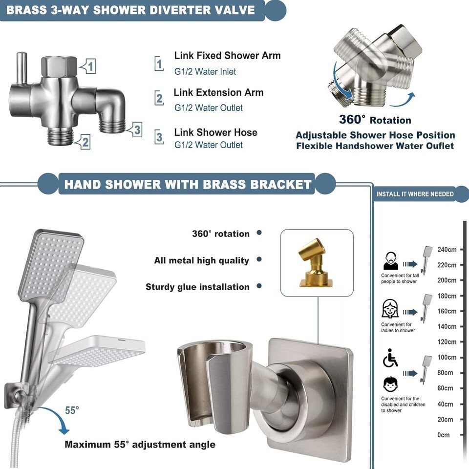 ?Upgraded 3-Way Diverter Valve?: Made of solid brass, it can be used with a shower head/hand shower alone, or with two showers at the same time. The shower diverter has a large flow channel design with no water flow restrictions. The unique rotatable shower connector best solves the wrong angle of most handheld shower diverters to keep the hose sagging and prevent tangling in the shower.