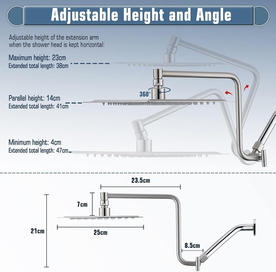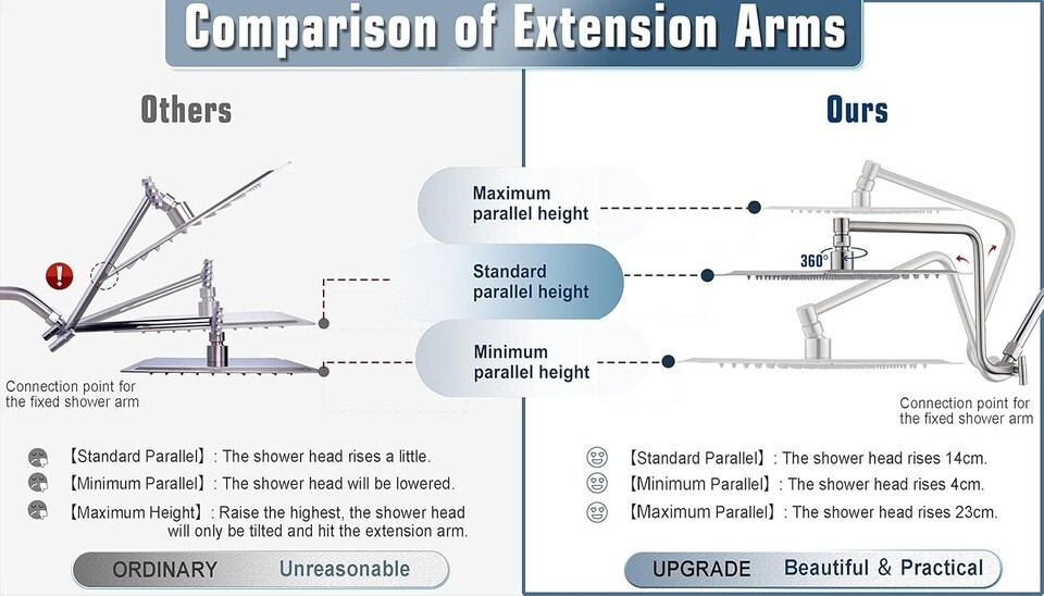 ?Upgraded 12" Extension Arm?: Z-shaped practical shower arm, height can be adjusted up and down, so that your large size shower head is always vertical and will not hit the shower arm, instead of sloping water like ordinary straight shower arms .Made of all metal, equipped with locking screws, not easy to fall.
