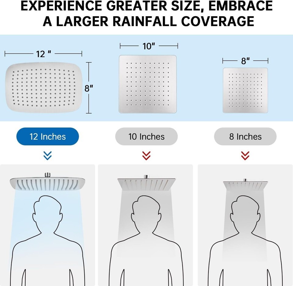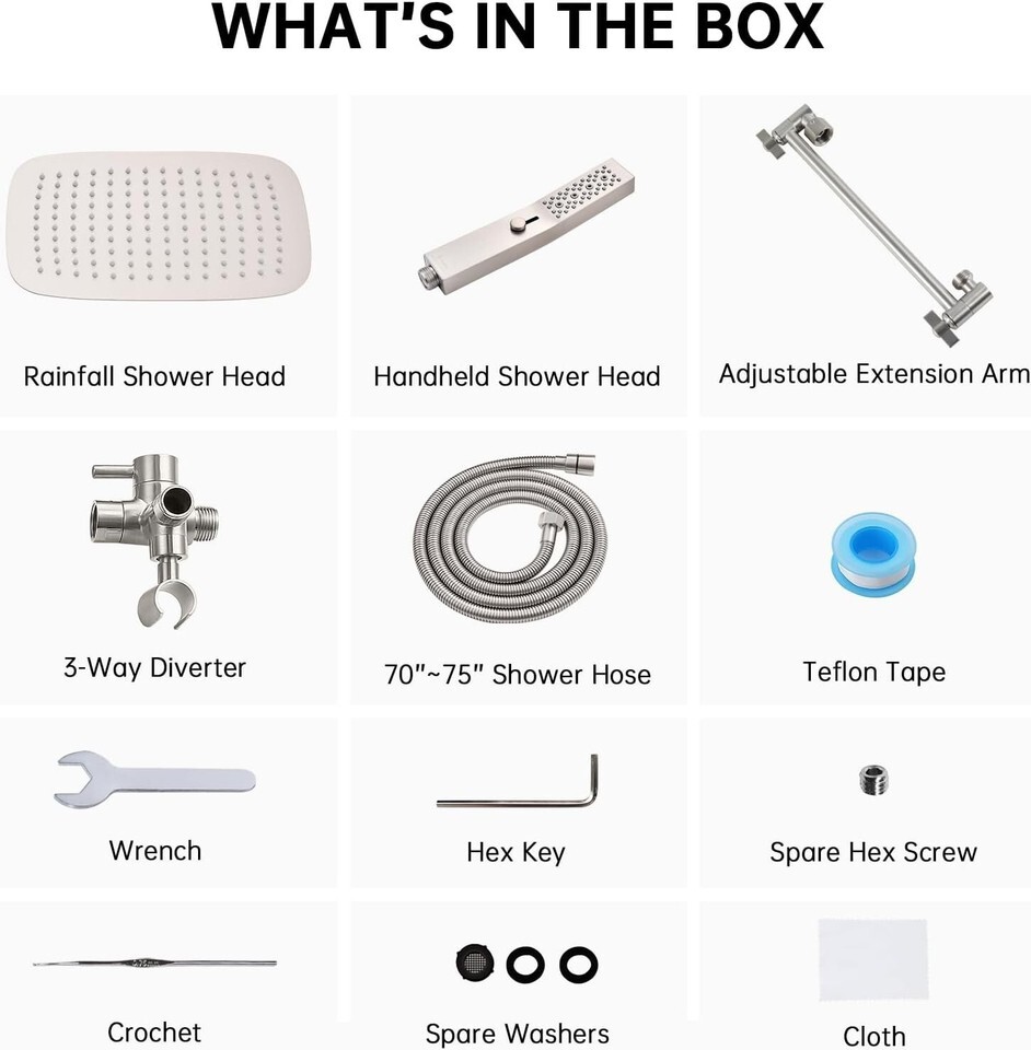 ?METAL RAIN SHOWER HEAD AND HAND SHOWER WAND: Square design rain shower head and hand shower wand are made from stainless steel and brass. The 12-inch rectangular rainfall showerhead has a wide coverage area that can easily cover your entire body. METAL construction is more durable than plastic, and provides a longer service life